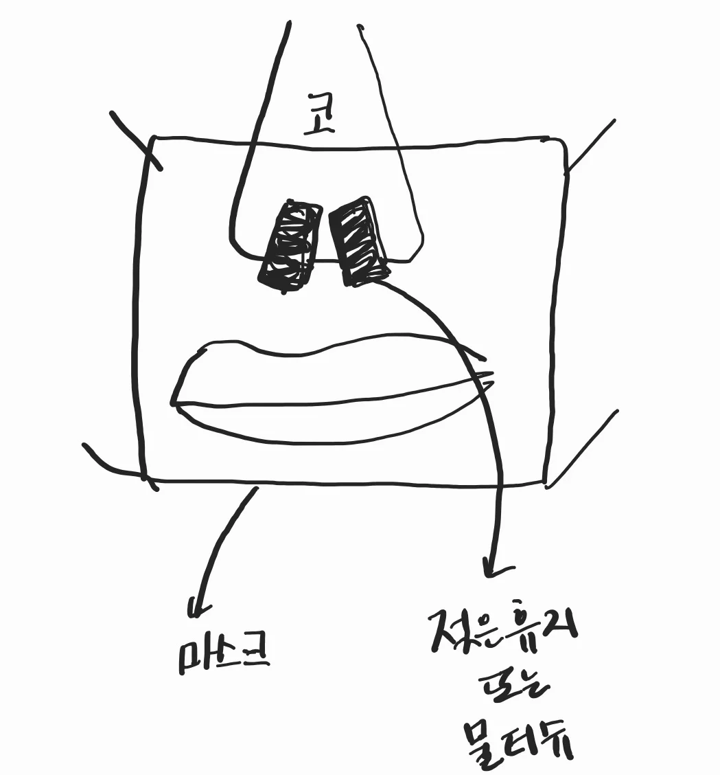 콧구멍에 작게 말은 젖은 휴지나 물티슈를 끼운 후 마스크를 착용하는 방법입니다.
